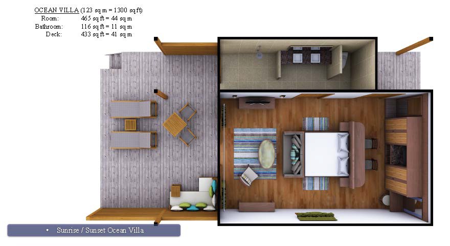 Площадь номера — 105 кв.м. Романтические водные виллы. Состоят из спальни с большой двуспальной кроватью, гостиной зоны, ванной комнаты с тропическим душем, террасы с шезлонгами.
