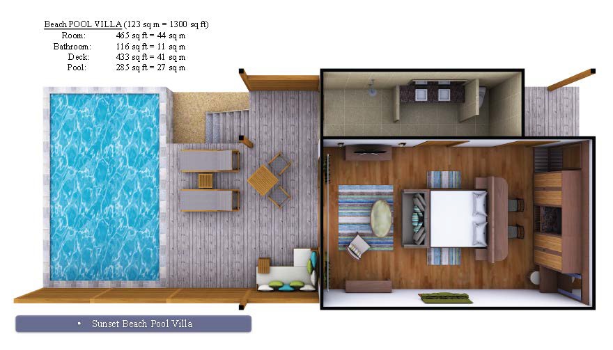 Площадь номера — 132 кв.м. Пляжные виллы с бассейном, расположены всего в нескольких шагах от песчаного пляжа и уютной лагуны с видами на закат. Состоят из спальни с большой двуспальной кроватью, гостиной зоны, ванной комнаты с тропическим душем, террасы с шезлонгами и бассейном.